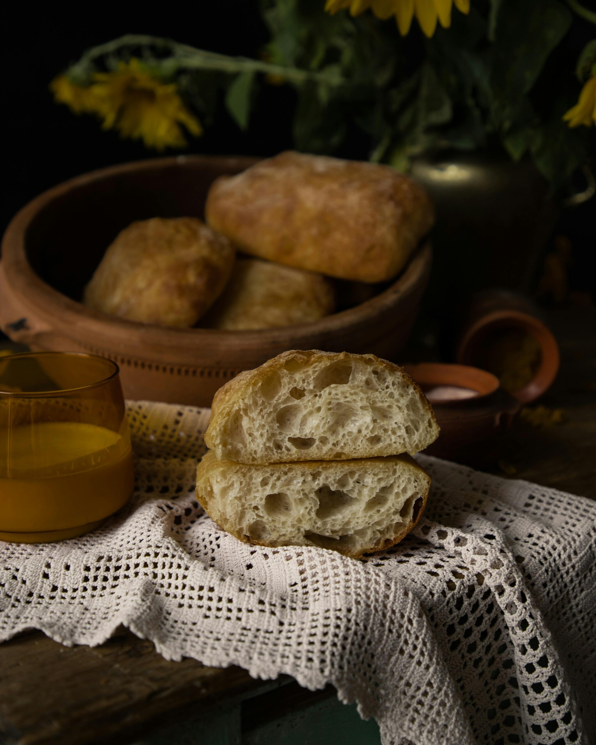 Ζύμωμα 12’στην αργή ταχύτητα και 3’στην γρήγορη. Θερμοκρασία ζύμης 28°C. Ξεκούραση 20′ Στόφα 45′ Ψήσιμο σε συνήθη θερμοκρασία ψησίματος ψωμιού,